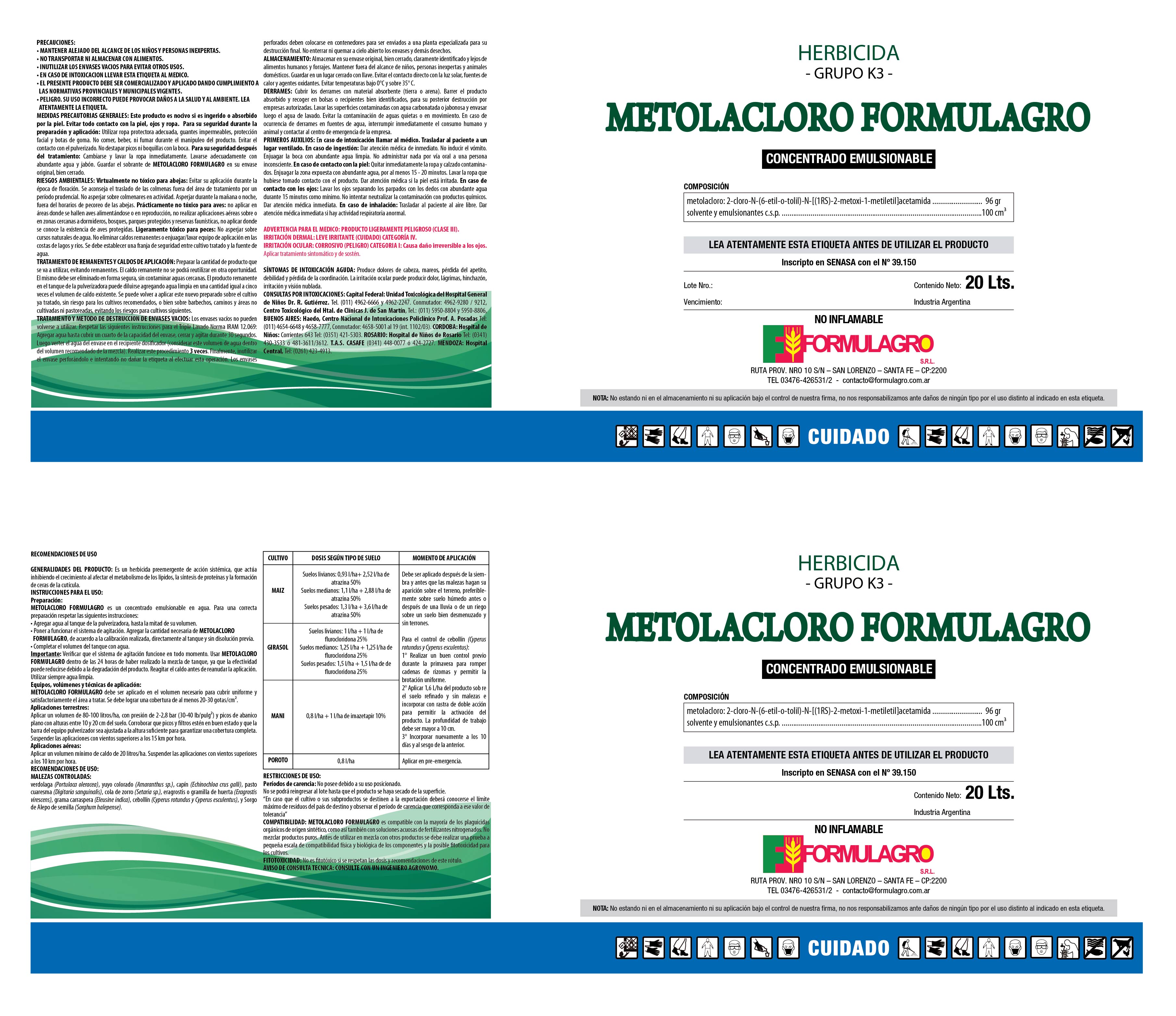Herbicida de pre-emergencia para el control de malezas gramíneas y algunas de hojas anchas anuales en pre siembras y pre- emergencias de los cultivos de Soja, Maíz, Girasol y Poroto.